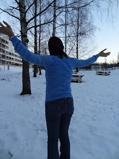 I started with a new pullover earlier this month, Bayside Pullover. It's simple, but the cables in the side make the sweater a bit more delicate than just the normal simple sweater. A while ago I bought Bugga from Sanghuin Gryphon, and I haven't found the right project for the yarn until now. This sweater was perfect for the yarn. The question was if 3 skeins of 113 g each was enough for a sweater, but I decided after a look at Ravelry, that it had to be enough. The sweater is knitted top down, and I knitted the neck and raglan first, then I knitted a couple of centimeters on the yoke before I started knitting the arms. I finished both the arms first before I finished the yoke. I didn't want to end up with two different length on the arms if I had too little yarn. I had to do some adjustments since Bugga is a bit thinner than the yarn the pattern originally calls for. I decreased only four stitches on the arms and one decrease on the yoke, but I increased three times. I had 16 g of yarn left when the sweater was done. Not bad! The sweater fits and the yarn is so soft and delicate. I'm going to wear this at work tomorrow! Sorry about the pictures, but it was around minus 20 Celsius outside when the pictures are taken, so I had to wear mittens so I wouldn't freeze.